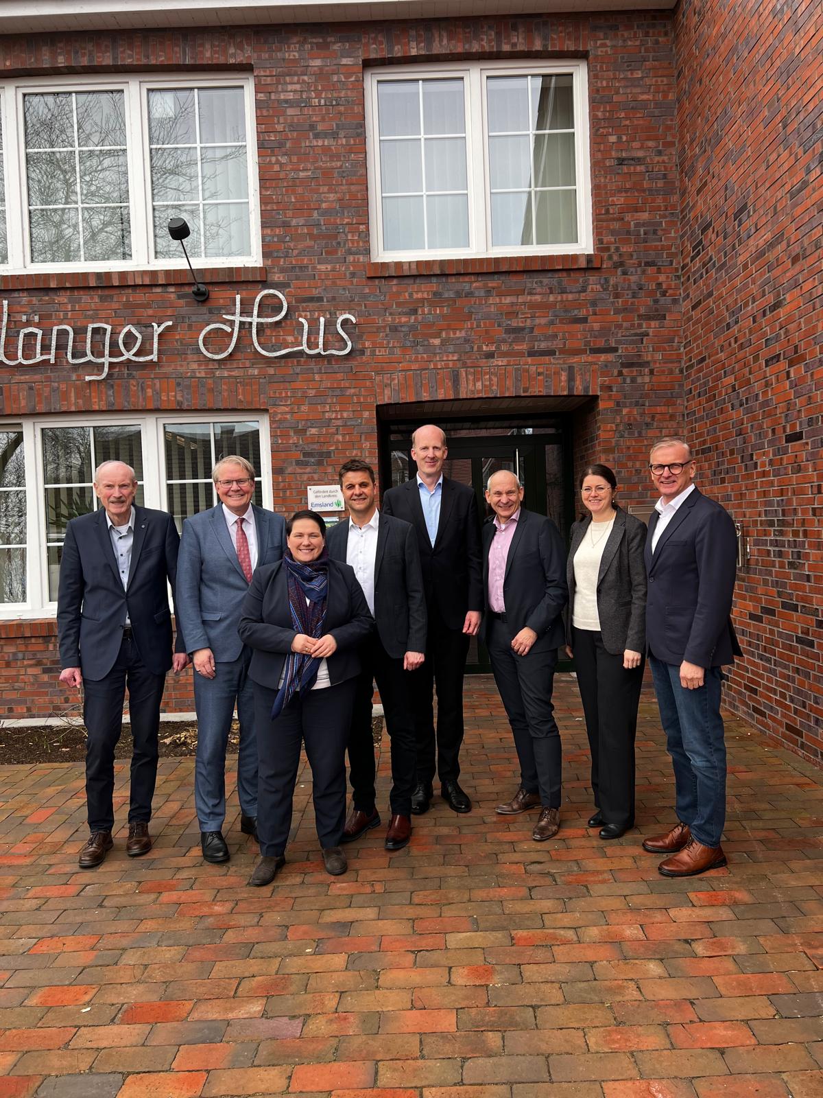 Bildunterschrift (v. l. n. r.): Niederlangens Bürgermeister Hermann Albers, ArL-Landesbeauftragter Nikolaus Jansen, Ministerin Malenie Walter, Hartmut Moorkamp MdL, die ArL-Dezernatsleiter Dr. Holger Janßen, Uwe-Heinz Bendig und Sylvia Backers sowie Lathens Samtgemeindebürgermeister Helmut Wilkens (Foto: Gemeinde Niederlangen).